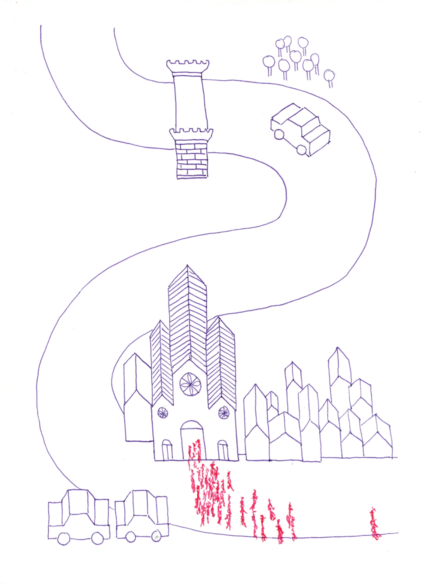 The church is the center of many towns and villages. Physical center but also, mostly at other times, the center of social life. This is one of a series of illustrations about how people interact with towns.